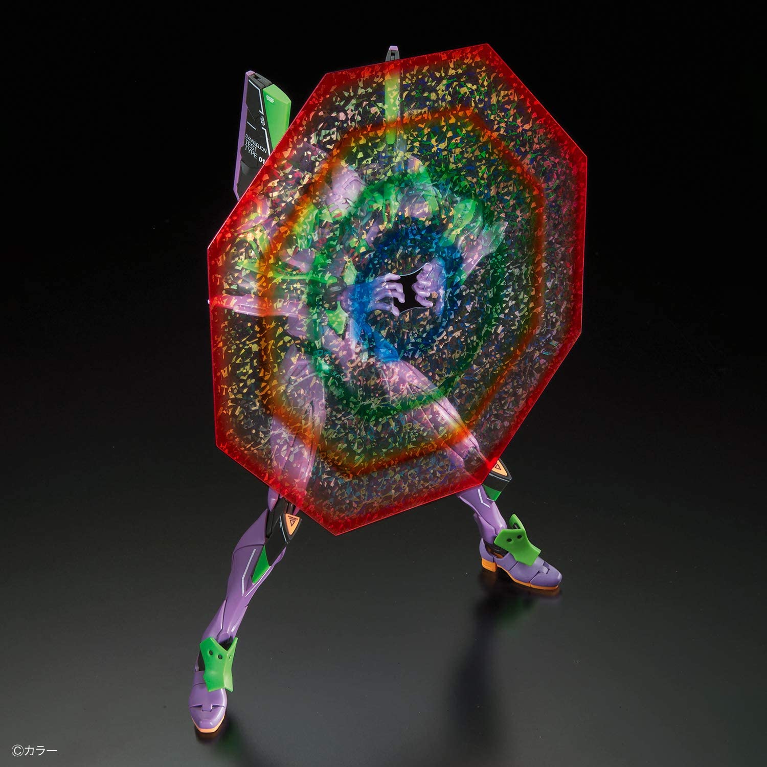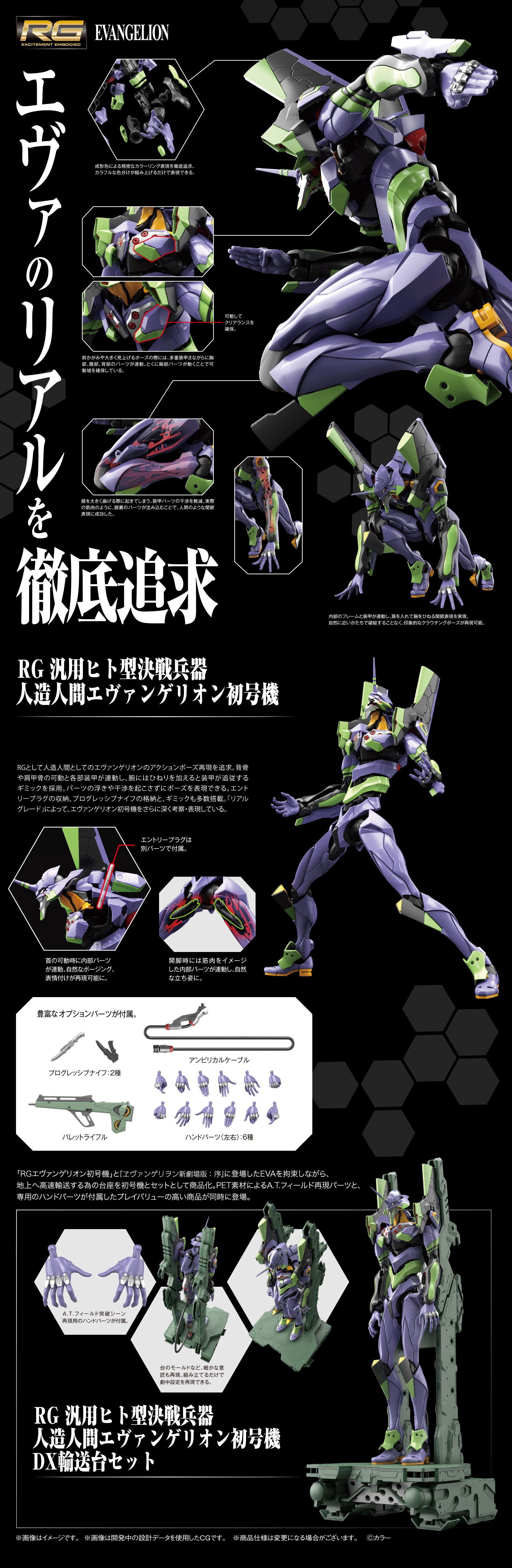 Sikke et navn, men her er den fra Bandai, RG All-Purpose Humanoid Decisive Battle Weapon Artificial Human Evangelion Unit 01 fra "Rebuild of Evangelion!" Første EVA i RG serien, med meget nøjagtig genskabelse og øje på detaljerne fra originalen. Mellemgulvet, brystet og ryg dele er linket sammen som et link af armor. Delene omkring knæet nukker som rigtige muskler. Den kan desuden lave interlock, når nakken er posed, som gør udseendet mere naturligt. Her med platform pakken inklusive.