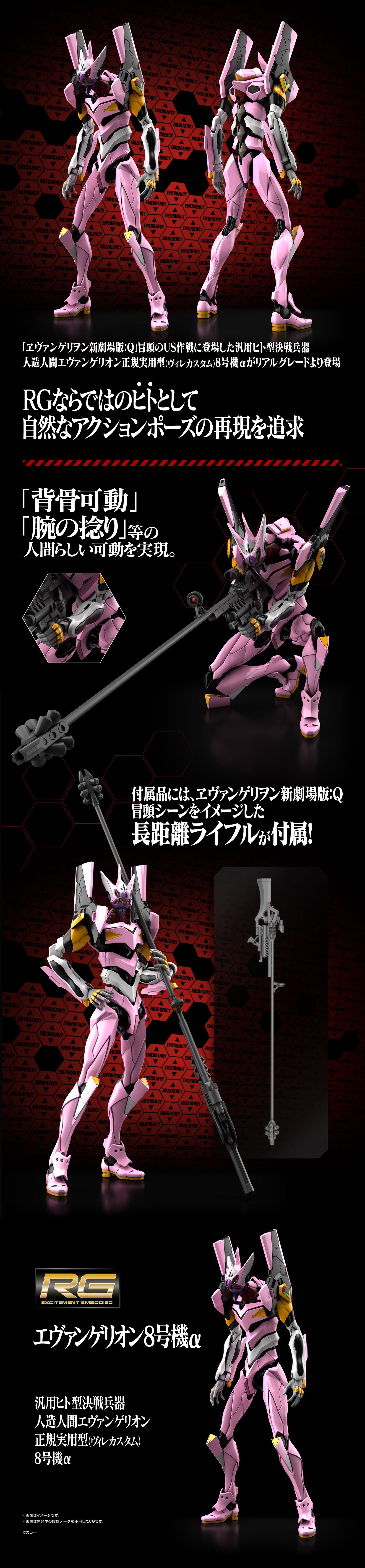 Evangelion 08 Alpha, som var med i "Evangelion: 3.0 You Can (Not) Redo" får nu også et RG kit Samme geniale joint system, som at efterligne den menneskelige bevægelighed. Super long-distance rifle er inkluderet. Støbt i fantastiske farver!